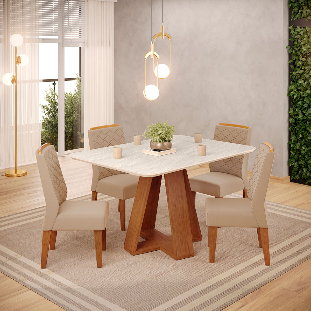 Conjunto Sala de Jantar 4 Cadeiras Tampo Sem Vidro DJ Móveis Kiara Freijó Quartzo Lidia Veludo Kraft