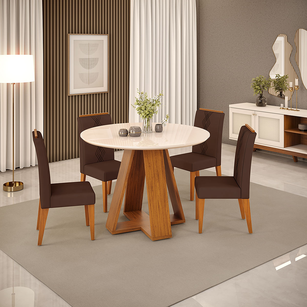 Em busca de um conjunto com mesa redonda e 4 cadeiras? Na DJ Móveis, você encontra a Mesa Kiara Freijó/Off White, a opção perfeita para complementar a sua sala de jantar. Ela apresenta uma estrutura reforçada com design moderno em formato de trapézio inclinada e com peças dispostas em formato de cruz, o que dá um toque diferenciado e elegante. Além disso, ela possui um tampo chanfrado de madeira com vidro que possibilita guardar as cadeiras. Acomoda até 4 pessoas de maneira confortável, tornando os seus momentos em família e amigos ainda mais especiais. Já as Cadeiras Yasmin Freijó com tecido veludo Moca foi desenvolvida a partir de testes de ergonomia e resistência, para garantir extrema segurança e conforto a você. Sua estrutura com pés de MDF oferece melhor durabilidade e estabilidade. O espaldar, em MDF revestido, mantém um visual moderno e facilita a movimentação da cadeira. Além de uma confortável espuma, o seu encosto ainda possui um incrível bordado ondulado e sutil, para agregar ainda mais elegância ao produto. Aproveite e deixe o seu lar mais aconchegante com esse conjunto para sala de jantar.