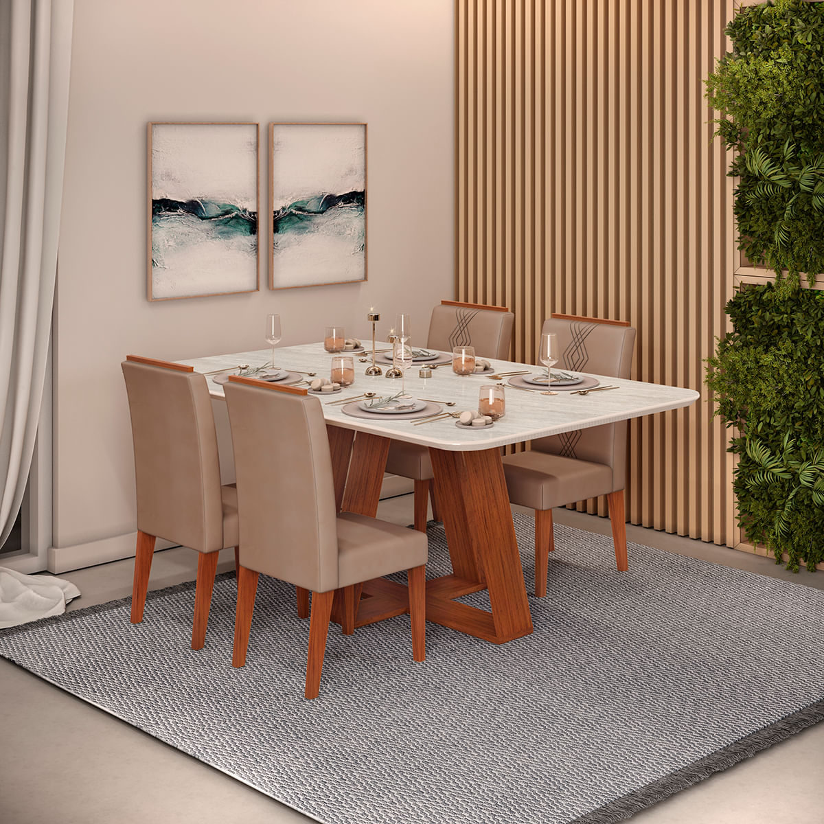 Deseja renovar sua sala de jantar? A DJ Móveis tem a solução perfeita para você. A Mesa Retangular Kiara Freijó Quartzo e as 4 Cadeiras Yasmin Freijó Veludo Kraft é o conjunto que faltava em seu lar. Com design moderno, a mesa possui tampo chanfrado e seus os pés o formato de trapézio inclinado, dispostos em formato de cruz, criando assim um desenho vazado. Apesar de sua aparência robusta, a peça é leve e ainda permite guardar as cadeiras embaixo do tampo, otimizando espaço e facilitando a limpeza. O modelo de Cadeiras Yasmin compõem o ambiente com elegância e comodidade. Ergonômica e resistente, possui charmoso bordado nos encostos e seus assentos são estofados com espuma de alta densidade para mais conforto e durabilidade. Aproveite para comprar já o seu conjunto na DJ Móveis.