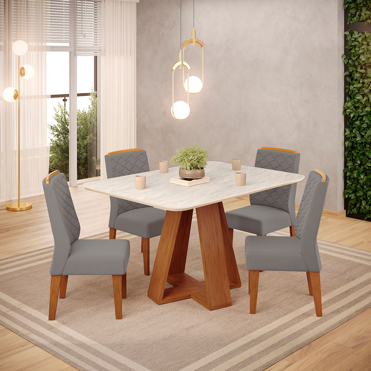 Conjunto Sala de Jantar 4 Cadeiras Tampo Sem Vidro DJ Móveis Kiara Freijó Quartzo Lidia Veludo Lunar